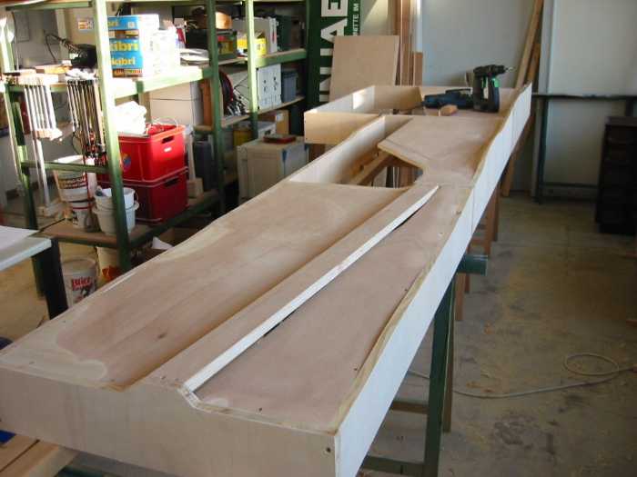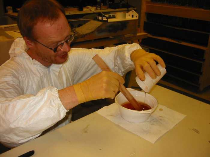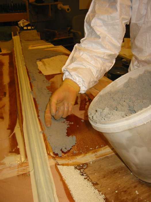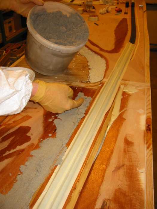Weil wir eine Modulanlage bauen, die oft transportiert werden muss, haben wir für Gips einen Ersatzwerkstoff gesucht, der sich gut verarbeiten lässt, leicht und beständig ist. Wir mussten nicht langen suchen, denn unser Werkstatt-Vermieter hat eine Firma für Modell- und Formbau. Er empfahl uns Filite und Poraver. Filite ist ein mineralischer Werkstoff, der in Pulverform geliefert wird. Er ist extrem leicht, hat eine gute Oberflächen Festigkeit und lässt sich trotzdem mit handelsüblichen Werkzeugen wie Stecheisen, Schleifpapier usw. bearbeiten. Poraver ist ein Blähglasgranulat, welches normalerweise zum Wärmedämmen verwendet wird. Es ist in verschiedenen Körnungsgrößen verfügbar. Wir benutzen es in der Hauptsache zum Füllen größerer Hohlräume und als Unterbau für Filite. Filite wird, ebenso wie Poraver, mit Epoxydharz angemacht. Diese bindet das Pulver zu einem gut zu formenden Brei, der formstabil bleibt und eine offene Zeit von ca. 24 Stunden bietet. Man muss zu diesen Werkstoffen jedoch sagen, das bei der Verarbeitung Sicherheitshinweise beachtete werden müssen. Es hat sich als Vorteil, im Bezug auf die Verbindung vom Holz zu Filite/Poraver, erwiesen die Holzflächen mit Harz vorzustreichen.