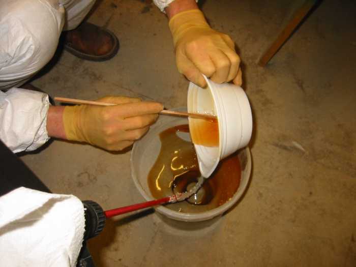 links Mischen des Harzes, es wird in separaten Behältern gemischt; rechts Es wird dann dem Filite beigefügt und mit Rührquirl vermengt