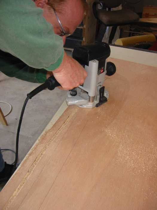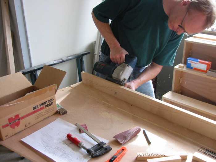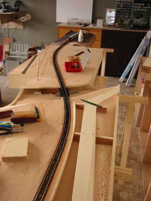 links: Modul mit der Erftbrücke bei Greven. Hier wurde die Platte dem Flussverlauf entsprechend eingeschnitten und tiefer im Kasten wieder eingesetzt. Am rechten Bildrand ist die Strasse zum Firmengelände von Greven zu sehen. Sie ist aufgeständert. Der Hohlraum wird anschließend verfüllt. rechts: Aussägen der hintern Geländestruktur mit der Stichsäge