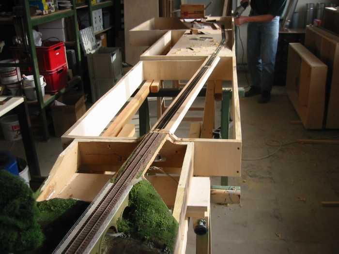 links: Bei diesem Modul liegt das Gleis auf einem Damm, dazu wurde rundum der Kasten tiefer geschnitten. In der Mitte liegt das Gleis nun auf einem Trassenbrett. rechts: Links und rechts der Trasse ist der Kasten mit Holzplatten verschlossen worden. Hier rauf wird nun die Landschaft modelliert.