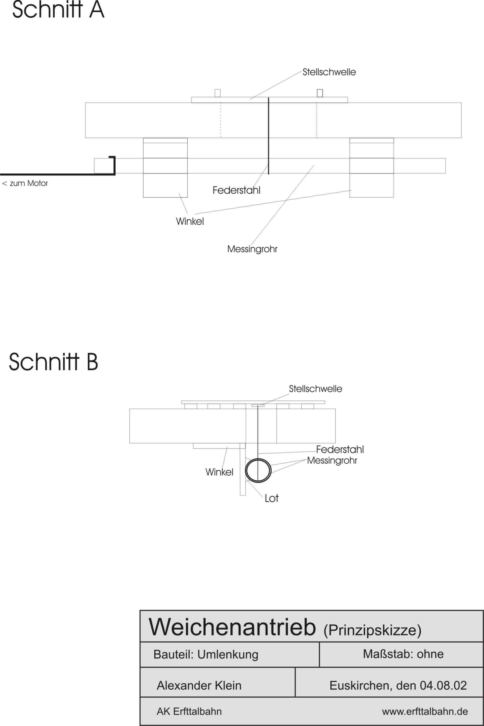 Die Weichen, mit der Ausnahme der Weichen auf dem Hettner Modul, werden mit Fulgurex-Antrieben gestellt. Die Antriebskraft wird über ein 1,5mm starken Messingdraht auf ein Umlenkgestell übertragen, welches dann die Weiche bewegt.