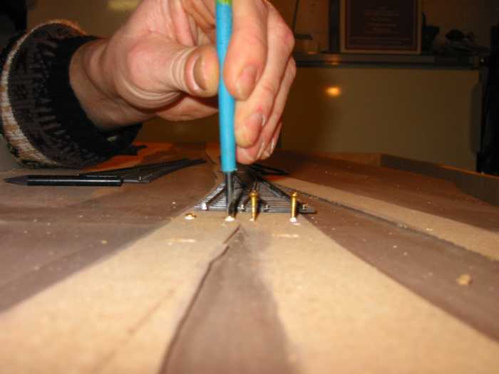 An den Modulübergängen werden die Gleise auf Messingschrauben aufgelötet, was ein exaktes Ausrichten ermöglicht.