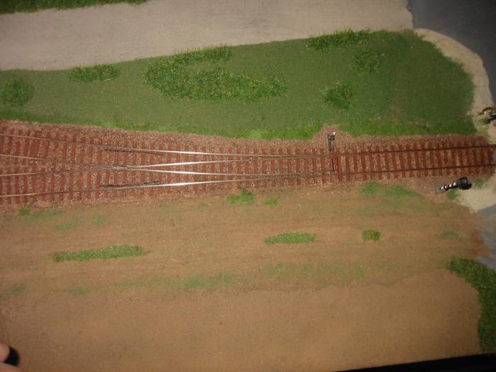 Die Gleise werden auf 3 mm starken Kork verlegt, um nachher ein besseres Bild des Gleiskörpers zu erreichen. Der Kork wird mit Korkkleber oder mit Pattex direkt auf das Holz geklebt. Die Gleise werden darauf verlegt und mit Reiszwecken fixiert. Diese bleiben auch beim Verkleben mit Weisleim (verdünnt 1:1 mit Wasser und einem Tropfen Spüli) drin. Nach dem Trocken des Leims können sie entfernt werden.