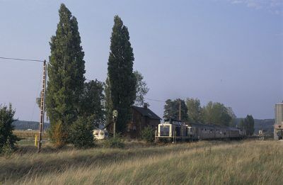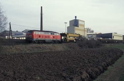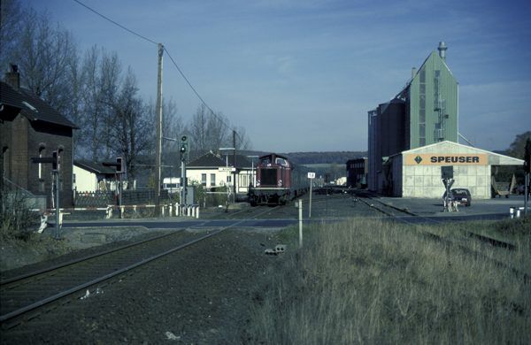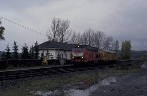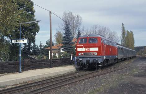 Links: 215 017 kommt am 08.11.1991 mit einem Hilfszug auf dem Weg nach Bad Münstereifel, wo ein Silberling entgleist ist, durch Arloff. Noch liegt das Gleis, was zum Anschluss der Thonwerke führt.; Rechts: 215 011 mit einem Personenzug aus Reko-Silberlingen am 21.11.1997 in Arloff. An schienentechnischen Anlagen sind nur noch die beiden Weichen im Streckengleis vorhanden. Alles andere ist bereits zurückgebaut. (Fotos: Werner Schwan)